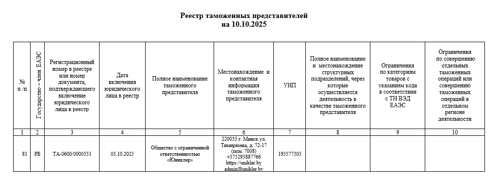 Компания ООО «Юниклер» включена в реестр таможенных представителей, утверждённый Государственным таможенным комитетом Республики Беларусь.