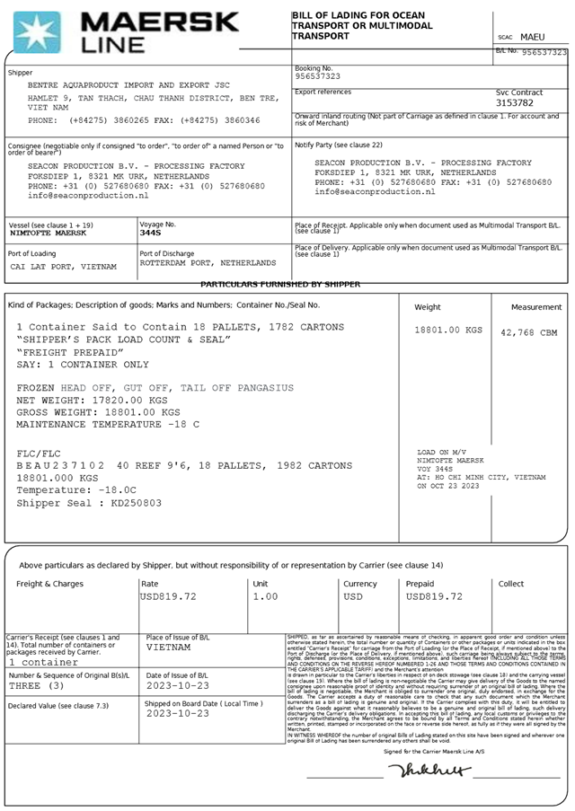 Пример MBL, оформляемый морской линией Maersk Line: